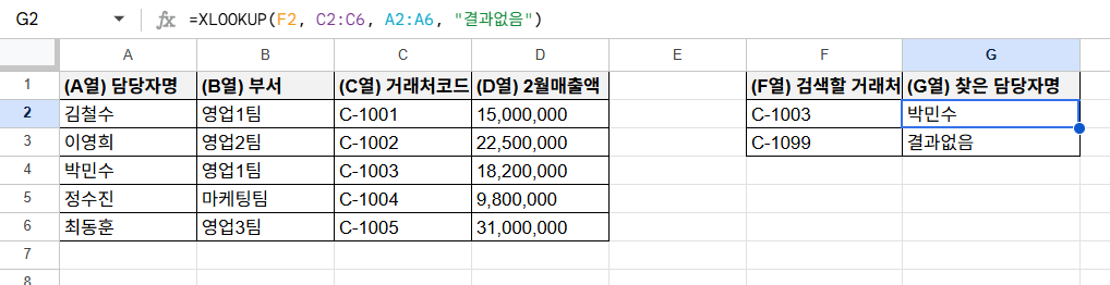예를 들어, F2에 “검색할 거래처 코드”가 있고 원본 표의 거래처코드가 C열, 담당자명이 A열이라면 다음처럼 입력하시면 됩니다.